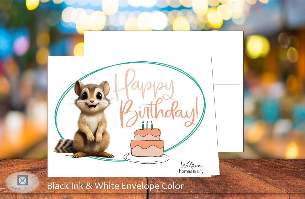 Card includes 3 options for inside card: pick from prewritten option, add your own custom message, or leave the inside blank. Select from 41 ink colors for name on bottom right corner on front of card. Select white or 19 choices of colored envelopes. Optional to add return address to envelope for additional fee. Sticker embellishment included for back of envelope.