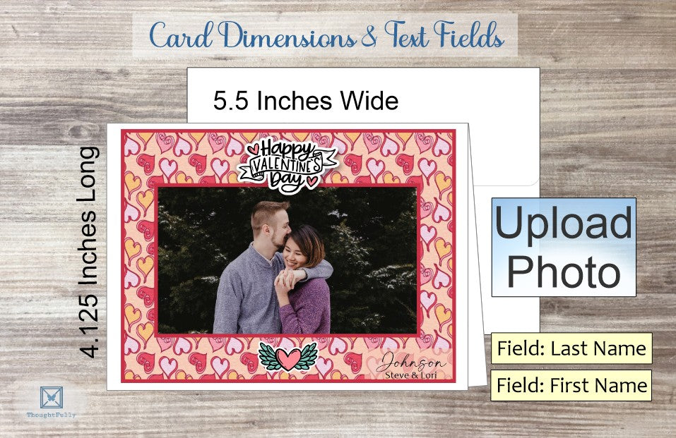 Card includes 3 options for inside card: pick from prewritten option, add your own custom message, or leave the inside blank. Select from 41 ink colors for name on bottom right corner on front of card. Select white or 19 choices of colored envelopes. Optional to add return address to envelope for additional fee. Sticker embellishment included for back of envelope.