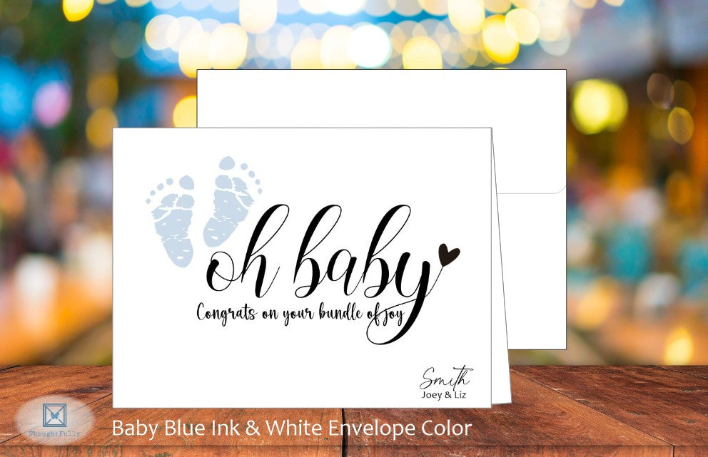 Select ink color for name on bottom right corner on front of card. Select white or 19 choices of colored envelopes. Optional to add return address to envelope for additional fee. Sticker embellishment included for back of envelope.