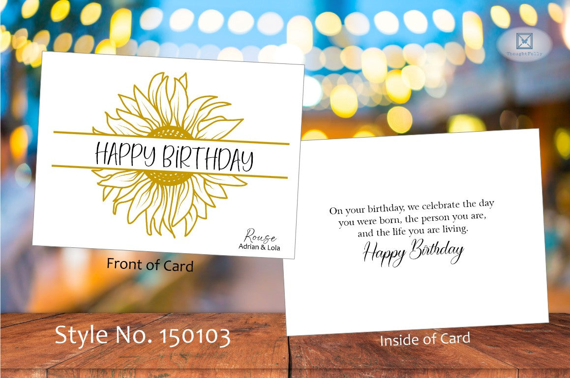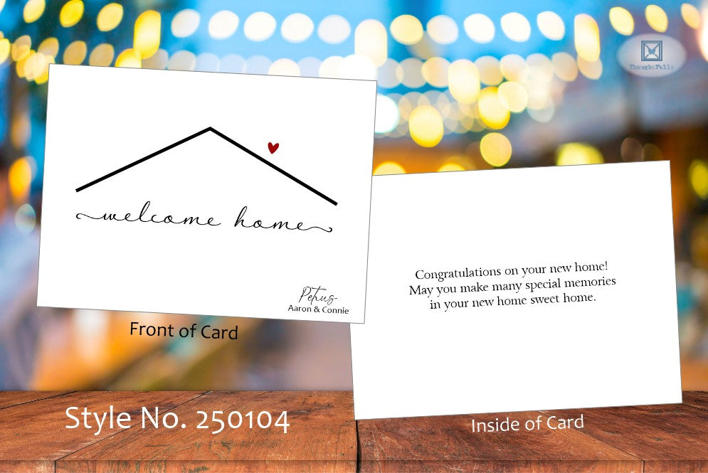 Pick single or multiple of each style to total 10 cards. Black ink for name in bottom corner. Select white or colored envelopes. For colored envelope, colors are preselected. Add return address to envelope for small additional fee. Sticker embellishment included for back of each envelope.