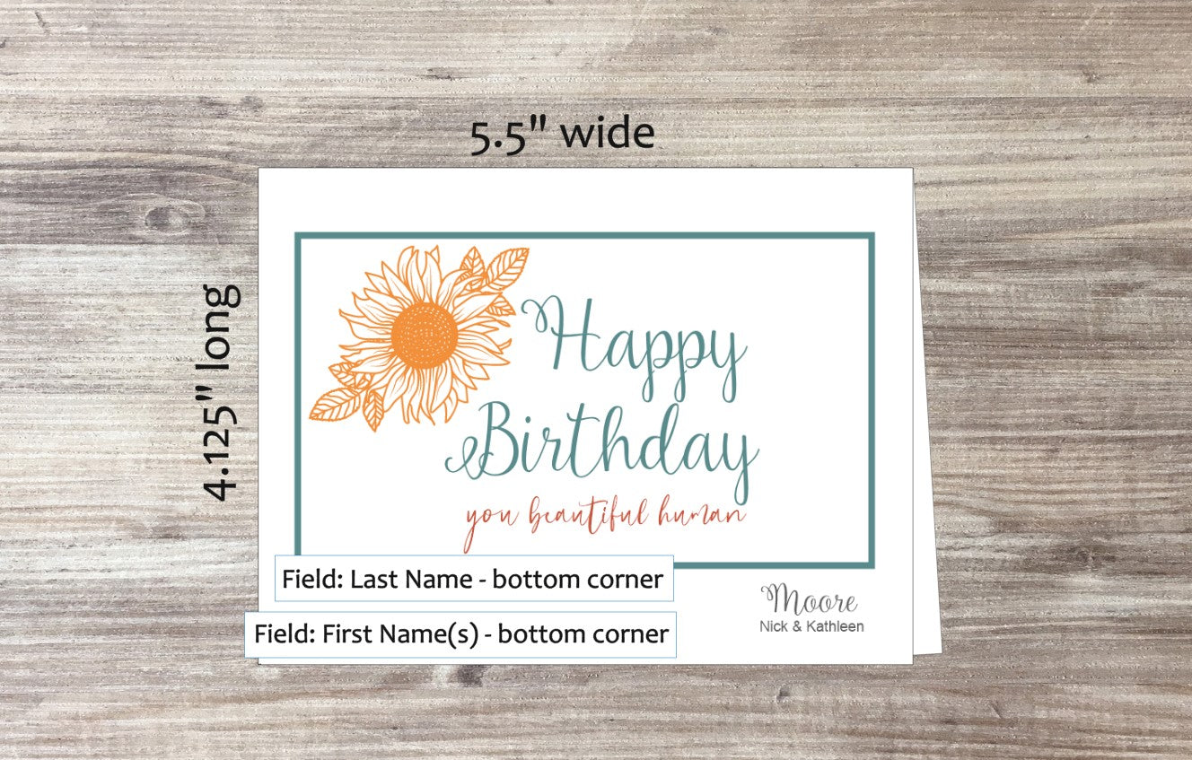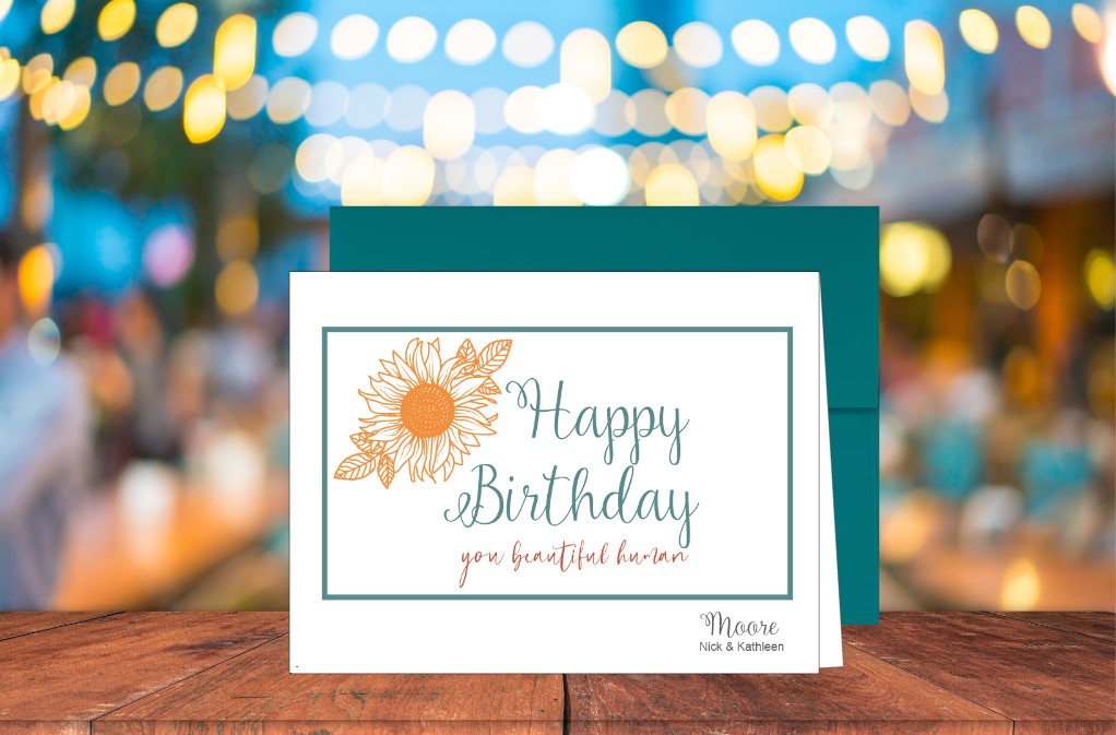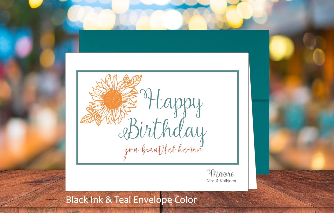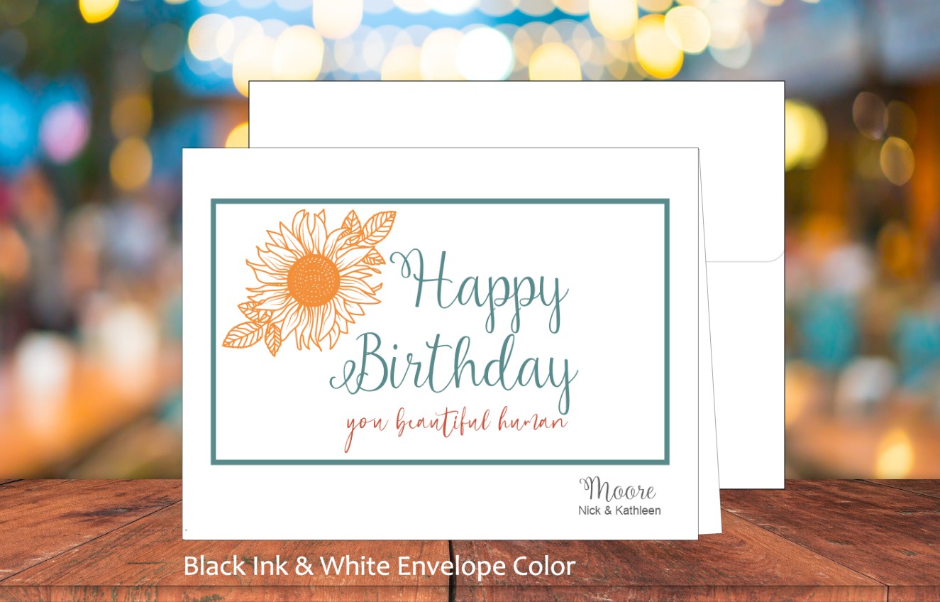 Card is blank inside. Select ink color for name on bottom right corner of card. Select white or colored envelope. For colored envelope, colors are preselected. Optional to add return address to envelope for additional fee. Sticker embellishment included for envelope.