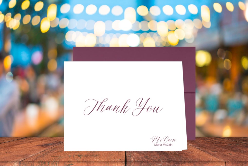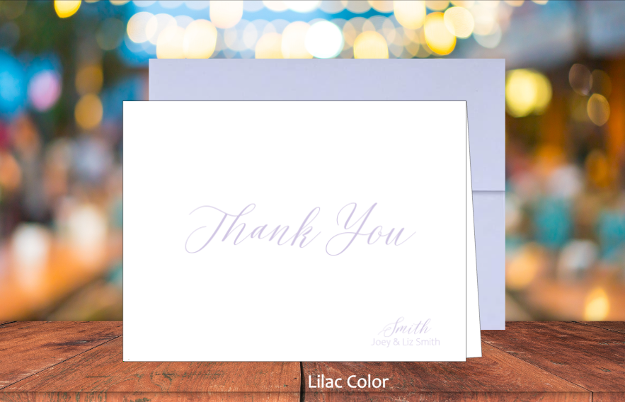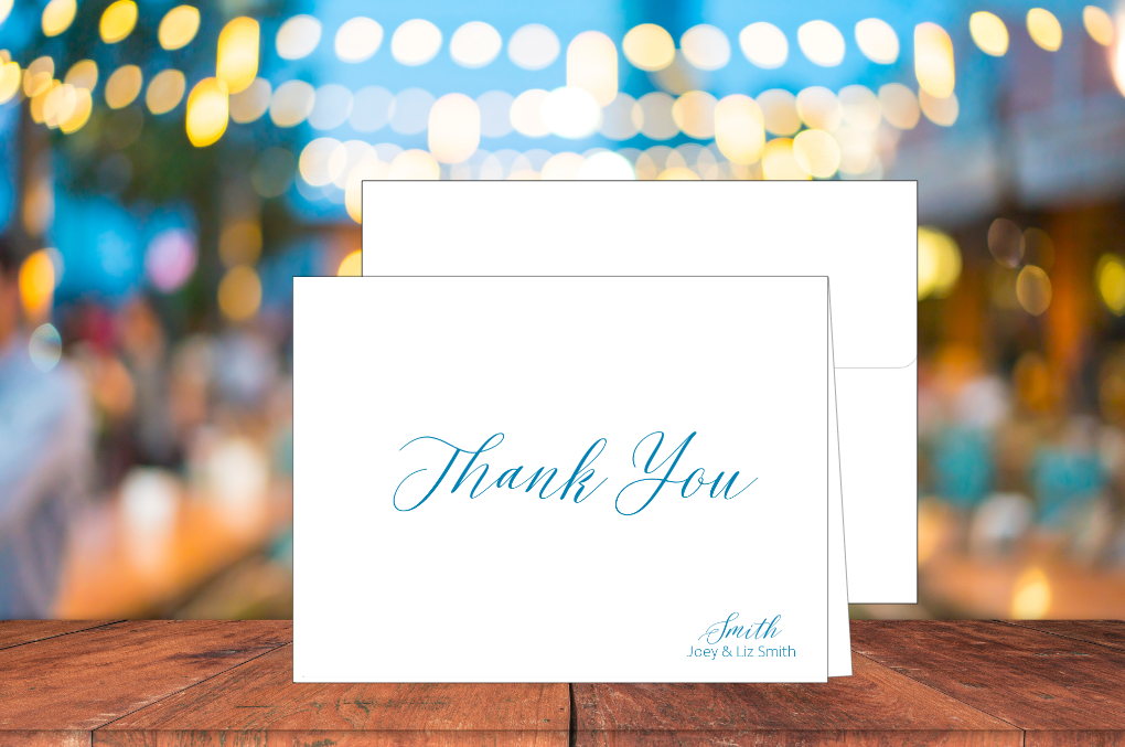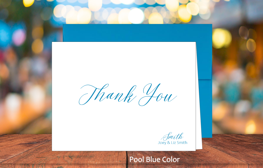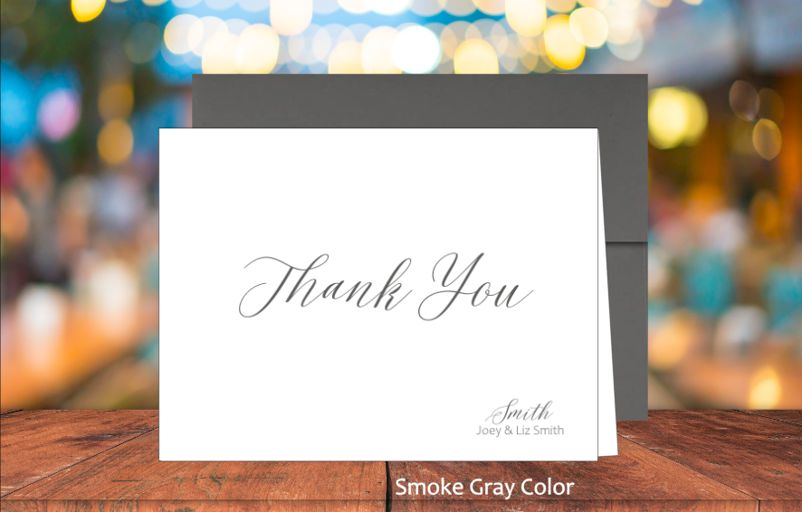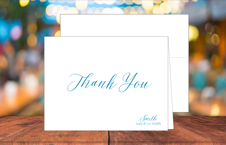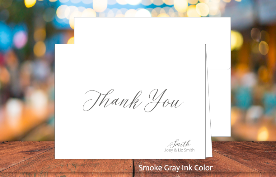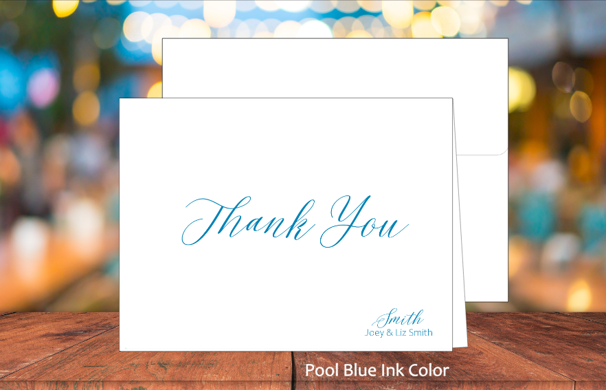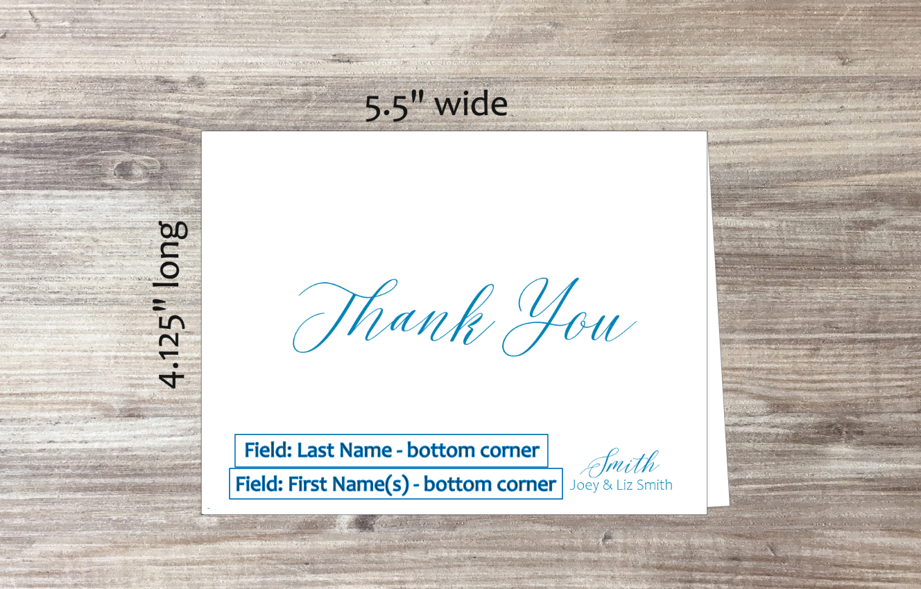 Card is blank inside. Select ink color for name on bottom right corner of card. Select white or colored envelope. For colored envelope, colors are preselected. Optional to add return address to envelope for additional fee. Sticker embellishment included for envelope.